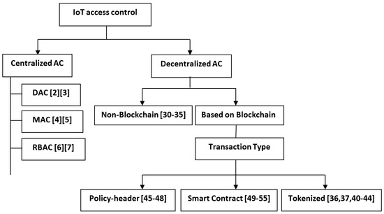 Access control (AC) is a mechanism that enables only authenticated entities to access the resources, as well as the authority to control those resources. In the IoT environment, access control can be classified into centralized and decentralized, and each can be categorized into subparts, as shown in Figure 2.