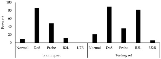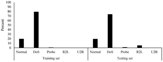 The KDD99 is very common between researchers in the IDS research. A survey by Reference [42] found that 142 studies have used the KDD99 dataset form year 2010 until 2015. The dataset is available with 41 features (excluding the labels) and five classes, namely Normal, DoS), Probe, remote-to-local (R2L), and user-to-root (U2R). The KDD99 (ten percent variant) contains 494,021 and 311,029 records in the training and testing sets. The classes in the training and testing sets of the KDD99 are imbalanced, as shown in Figure 1. The DoS class has the highest number of records, while the Normal class comes in second. Moreover, the testing set contains a higher amount of records that are classified as R2L. This distribution of records was found to contain a large amount of duplicated records. The number of records of each class with their amount of duplications is provided in Table 1.