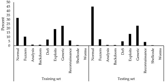 The percentage of class distribution in the UNSW-NB15′s training and testing sets.