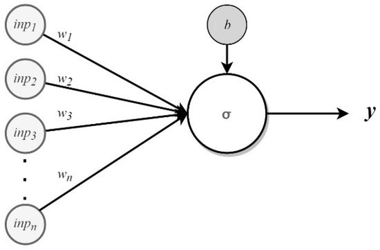 Formally, as illustrated in Figure 7, every input, , with weight, , corresponds to the power of the connection. The sum of the weights and the bias, donate to the activation function, , to generate the output, [45]. This process can be demonstrated by using Equation (4).