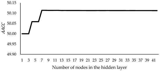 In order to keep the structure of the neural network simple, only one layer was set at the hidden layer. As for nodes in the hidden layer, a different number of nodes were set and evaluated with a maximum number equal to . The logistic sigmoid function was used as an activation function at the hidden and output layers, using Equation (5).