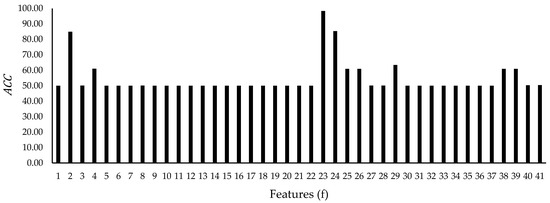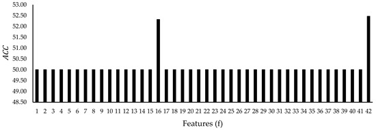 In order to report the , every single feature in the datasets was used as an input to train a BPNN model. The and average () that are resulted from the training can be calculated by using Equations (8) and (9), respectively.