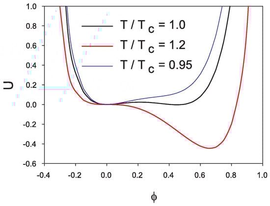 Potential (1) is displayed in Figure 1 for the values (3) of the parameters and for several temperatures. The change in minimum is clearly seen above and below : A (non)vanishing value for gives the minimum of U in the (de)confined phase. We notice that potential (1) is only Z3-symmetric and not U(1)-symmetric as is often the case in Lagrangians based on a complex scalar field, with typical potentials of the form [27]. A U(1)-symmetry can be recovered in the large- limit of Z-symmetric potentials, see [13,28].
