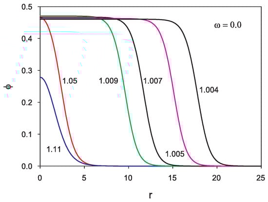 Profiles of for several values of . Distances are in units of .
