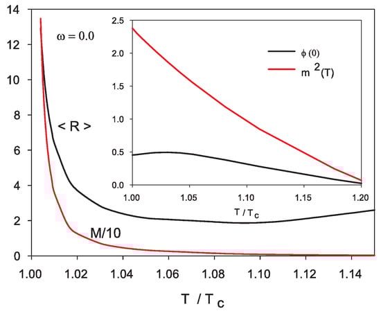 Evolution of the mean radius as a function of , the insert contains and the mass (12) of the scalar field. Distances are in units of and masses are in units of .