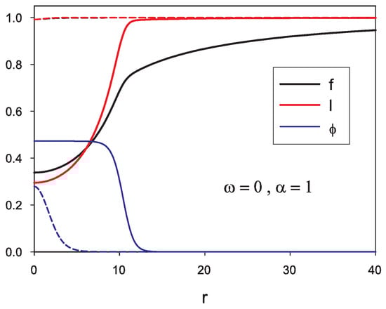 Profiles of the metric functions and of the scalar field for and two values of the temperature: (solid lines) (dashed lines). The radial variable r is in units of .