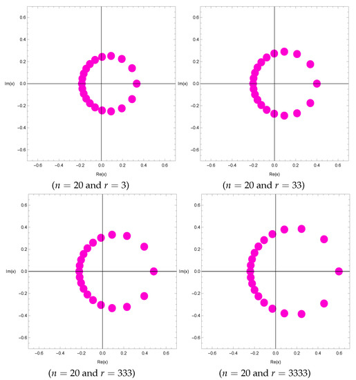 In this section, we would like to show some patterns for the roots of the higher-order -Genocchi polynomials for a given n and r, using numerical experiments. The higher-order -Genocchi polynomials can be found explicitly by using a mathematical program on computer. With the computer program, we examine the roots of the higher-order -Genocchi polynomials for a given r. The roots of the higher-order -Genocchi polynomials for and are displayed in Figure 1.
