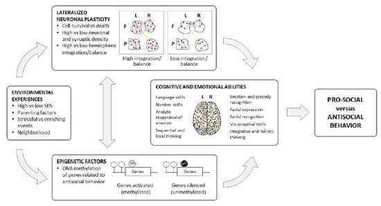 The ideas and findings described above highlight the integrative roles of lateralized neural function and environmental influences in the creation and expression of antisocial tendencies (e.g., [,]). A primary implication of environmental influences on the expression of antisocial behavior in biologically predisposed individuals is the possibility that we can control and decrease these expressions through interventions [,]. Just as external environmental effects on lateralized neurobiological mechanisms can lead to the expression of antisocial tendencies, the environment (i.e., exposure to an enriched environment) can reduce antisocial behaviors and facilitate prosocial behaviors [,].