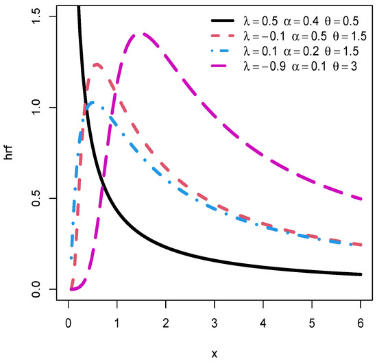 We observe in Figure 2 that the hrf has decreasing, and increasing-decreasing shapes when a maximum is observed. These characteristics are desirable for the modelling in diverse lifetime phenomena, as discussed in [25].