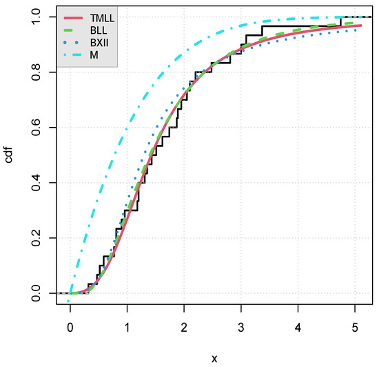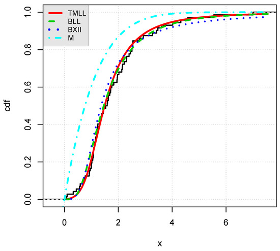 Figure 4. Curves of the estimated cdfs of the considered models over the empirical cdf for data set II. - The curve of the estimated pdf of the TMLL model, i.e., , as well as the curves of the estimated pdfs of the other models, all over the histogram for data sets I and II in Figure 5 and Figure 6, respectively.