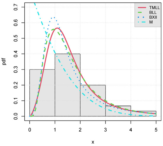 Numerous numerical techniques can be applied to determine , as those developed in the package AdequacyModel of the software R (see [28]). This package is very operational for data fitting and can be used quite efficiently to use TM-G models; only the cdf and pdf are needed to be implemented, and initial values are needed. In this regard, for the tested TM-G models, arbitrary initial values give stable numerical results.