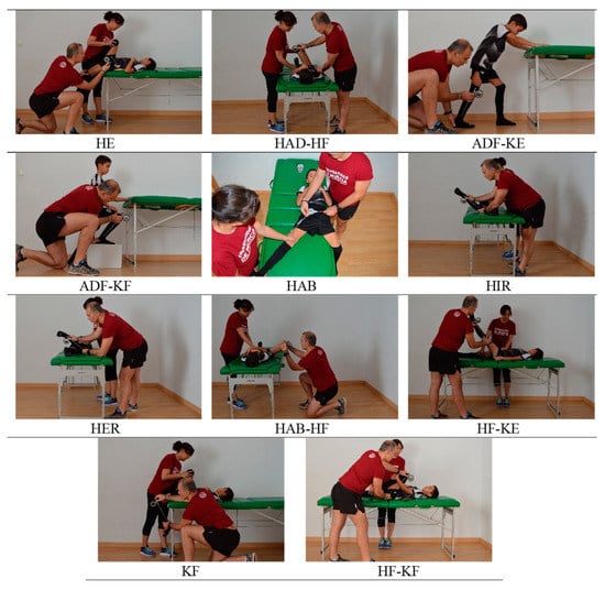 Eleven maximum passive hip (n = 8), knee (n = 1), and ankle (n = 2) ROMs were taken. The ROM assessment was performed according to the method previously described [,]. Figure 1 represents the maximum passive tests evaluated using the ROM-SPORT I battery [,]: dorsiflexion of ankle with flexed knee (ADF-KF) and extended knee (ADF-KE); flexion of knee (KF); hip extension (HE); hip adduction with flexed hip (HAD-HF); abduction of hip with flexed hip (HAB-HF) and hip at 0° (HAB); hip internal (HIR) and external rotation (HER); flexion of hip with extended knee (HF-KE) and flexed knee (HF-KF) ROMs. Both, the non-dominant and the dominant lower limb were evaluated. The data related to hip total rotation (HTR) were calculated as the sum of the HER and HIR values.
