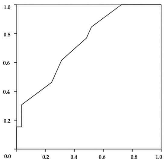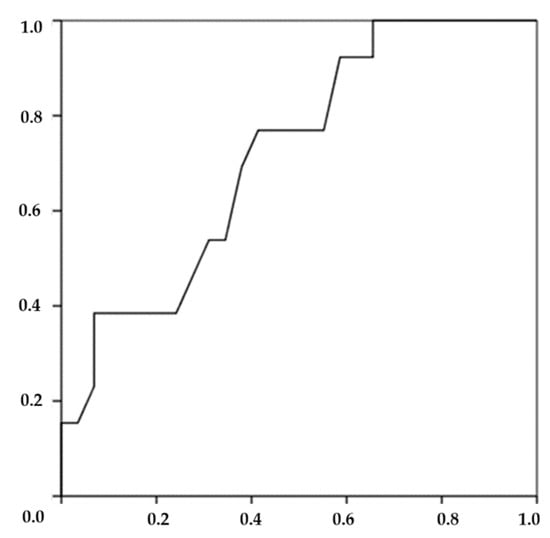 The predictive model for EA-LBP displayed a good accuracy for HAD-HF and KF []. HAD-HF (AUC = 74%, p = 0.015, standard error: 0.080, 95% confidence interval: 0.580 to 0.892) and KF (AUC = 72%, p = 0.025, standard error: 0.081, 95% confidence interval: 0.559 to 0.878) demonstrated a high precision of discriminating against EA-LBP (Figure 2 and Figure 3). ROC curves determined limited HAD-HF < 26° (sensibility 0.85% and 52% specificity) and limited KF < 128° (sensibility 77% and 41% specificity) as the optimal cutoff values for predicting LBP in EAs.