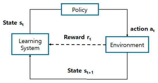 The standard structure of the RL [17,18,19] is given in Figure 1. The environment and agent of the learning system interact continuously. The agent, based on the policy, selects an action at in the current state st. The environment will then supply a reward to the agent based on the action at, and create a new situation, st+1. In the environment, the state st, the action at, the reward rt+1, the new state st+1, and the new action at+1 are presented in a circular form. RL attempts to teach the agent how to improve the action, when placed in an unknown environment, by acquiring the near-optimal Q-values that achieve the best results for all states. The agent takes advantage of the rewards given by the environment after selecting an action in every state to update the Q-values for a convergence of optimality. The constant issue of a trade-off between exploration and exploitation in the unknown environment in an RL algorithm has yet to be addressed. On the one hand, choosing the action with the best-estimated value implies that the agent exploits its current knowledge. On the other hand, choosing one of the other actions implies that the agent explores how to improve its estimate of the values of such actions. The exploitation maximizes the reward system in the short term. However, it does not guarantee a maximization of the accumulated reward in the long run. As such, although the exploration reduces the short-term benefits of the total rewards, it produces the maximum reward in the long run. This is because, after the agent has explored the actions at random, allowing the agent to check for better alternatives, it can begin to exploit them. It must be noted that exploitation and exploration are mutually exclusive. Hence, the agent cannot perform both exploration and exploitation in one selection. Therefore, it is fundamentally essential to balance the exploration and exploitation for the convergence of the near-optimal value functions. The most common algorithm for balancing this trade-off of exploration and exploitation is the ε-greedy algorithm. In this algorithm, the action with the maximally estimated value is called the “greedy action,” and the agent usually exploits its current knowledge by choosing this so-called greedy action. However, there are other chances of probability ε for the agent to explore under a random selection, i.e., “non-greedy actions.” This type of action selection is called a ε-greedy algorithm [17,18,19].