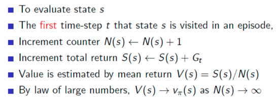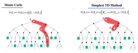 Furthermore, two different approaches, MC and TD, are applied when dealing with the trade-off between online and environments offline for determining the Q-value functions in RL [17]. TD can learn before knowing the final outcome. Thus, TD can learn online after every step. However, MC can only learn from complete sequences. Thus, MC learning is offline. Figure 2 shows a significant difference between MC and TD. In Figure 2, V(St) is the value fuction at St and Gt is the total discounted reward. α is the learning rate and γ is the discount factor. Rt+1 + γV(St) is the estimated return, also known as the TD-target, and [Rt+1 + γV(St) − V(St)] is TD-error. In addition, Figure 3 shows a first-visit MC policy evaluation [17].