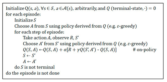 This update can be performed after every transition from a non-terminal state st. Here, Q(st+1, at+1) is determined as zero if st+1 is terminal. Every element of the quintuple event (st, at, rt+1, st+1, at+1) is used in the updated Formula (1), which is a transition from a pair of one state st and action at to the next. Thus, this quintuple leads to the name Sarsa. The Sarsa algorithm is shown in Figure 4.