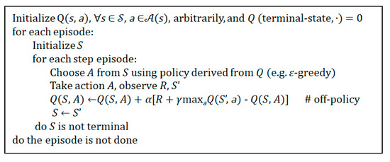 where α is the learning rate, γ is the discount factor, and rt+1 is the immediate reward received from the environment by taking action at in state st at the moment of time t. The Q-learning algorithm is given in Figure 5. The difference between Sarsa and Q-learning is the TD-target, which is mentioned above. The TD-target, R+ γQ(S’, A’) in Sarsa means “Update the current Q value with the immediate reward and the Q value of the next action”. However, the TD-target, R+ γmaxaQ(S’, a) in Q-learning means “an next action is chosen using behavior policy. But, the alternative successor action is considered.” Therefore, Q-learning is off-policy, which means it will “Evaluate target policy while following behavior policy”.