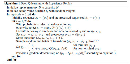 - Mnih, V.; Kavukcuoglu, K.; Silver, D.; Rusu, A.; Veness, J.; Bellemare, M.; Graves, A.; Riedmiller, M.; Fidjeland, A.; Ostrovski, G.; et al. Human-level control through deep reinforcement learning. Nature 2015, 518, 529–533. [Google Scholar] [CrossRef] [PubMed]