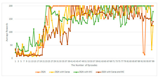 Figure 8 shows the average rewards of the four algorithms, DQN, DQN with Sarsa, DQN with MC, and the proposed DQN with MC and Sarsa on Cart-Pole [27]. From these results, we can observe that DQN with only offline MC and the proposed DQN with MC and Sarsa have guaranteed better rewards and converged sooner in the final goal than the other two algorithms. This might indicate that the proposed algorithm can work without an on-policy TD or Sarsa. However, Cart-Pole balancing is simpler than the other tasks.