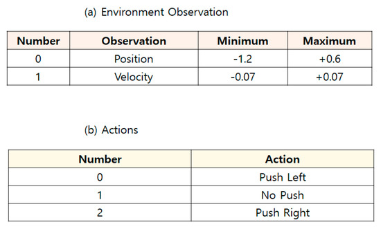For the MountainCar [28], there are two observations and three discrete actions, as shown in Figure 9.