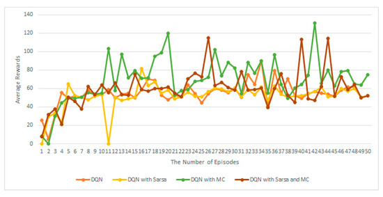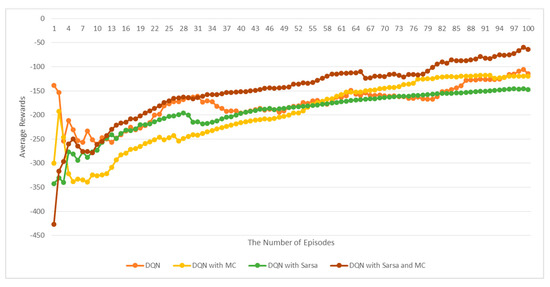 Figure 12 shows the average rewards of four algorithms: DQN, DQN with Sarsa, DQN with MC, and the proposed DQN with MC and Sarsa on LunarLander [29]. From these results, we can see that the proposed DQN with MC and Sarsa achieves the most stable performance for LunarLander, which is more complex than Cart-Pole or MountainCar. However, the results show that our proposed algorithm and DQN with MC achieved a better performance. Thus, we attempt to make more comparisons with only the proposed algorithm and DQN with an MC based on the environments with some time-constraints. The results are described in Section 4.4.