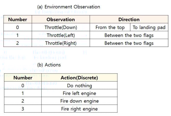 In the LunarLander [29], there are three observations and four discrete actions, as indicated in Figure 11. LunarLander as a Box2D-based game was developed by Atari. The landing pad is at the coordinates (0, 0). An approximately 100 to 400 point reward is given by the environment from the top to the landing pad and at zero speed. If the lander moves away from landing pad, the reward is taken away. When the episode is terminated if the lander crashes, then the agent receives −100 or sits down, and then it receives +100. If each leg contacts the ground, it receives +10. In addition, it is possible to land outside the landing pad. It is considered solved when it obtains an average reward of 200 over 100 consecutive runs.