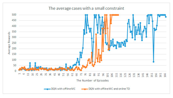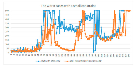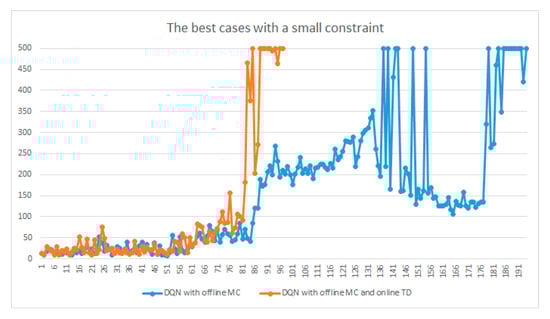 The maximum episode length of Cart-Pole is 500. For a better comparison of the solutions, we consider a few requirements between only DQN with MC and the proposed offline–online in DQN because the two algorithms show similar performances in Cart-Pole and MountainCar but not in LularLander. The first reason for this is that they receive a reward of −100 when they fall down prior to the maximum length of the episode. The other is that, if the average reward is more than 490 or equal to 500 over 100 consecutive runs, then the loop is terminated. These time constraints in these comparisons are based on the previous implementation [32], which suggests more restrictive time conditions. Moreover, based on empirical results, we adjust a small parameter between off-policy Q-learning and on-policy Sarsa. We followed the strategies of [10] between balancing Q-learning and Sarsa. However, in the experiment in this section, we change the parameter slightly, i.e., if r + 1 is between zero and a small constraint, which is selected based on many empirical trials, then we follow the immediate policy. The results of offline–online balance use in DQN show that Q-value divergence in the constraints is preventable. Figure 13, Figure 14 and Figure 15 indicate that offline–online balance use in DQN is worth considering for simple control tasks, such as Cart-Pole. We evaluated only 100 rounds owing to the simple environment.