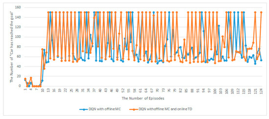 In MountainCar, we used the phrase “Car has reached the goal” in each round for better comparisons between the proposed algorithm and DQN with MC. It is considered solved when it obtains an average reward of +110.0 over 100 consecutive runs. In addition, we set the reward +150 to “Car has reached its goal.” We check how many times we can use “Car has reached the goal” in a limited number of runs. These qualified constraints in this comparisons are based on the previous implementation [33]. Figure 16 shows the proposed algorithm uses “Car has reached the goal” 42 times, while DQN with MD uses it 23. They show that the number of “Car has reached the goal” outputs of the proposed algorithm is higher than that obtained by DQN with MC. Under the strict constraints for comparisons of qualification, we demonstrated that the algorithm learns slightly faster than DQN with MC and can balance out the bias–variance trade-off during the training process. It is natural that if we use a transferred model, such as in [5], the proposed model could become faster during the training. However, the pre-trained model in [5] could fail in a variety of minor perturbations [3], specifically in a real-time environment. These results might indicate that the offline–online in DQN can check the performance in terms of the balance in offline MC and online TD. Moreover, it can provide better results when it comes to constrains such as real-world settings.