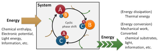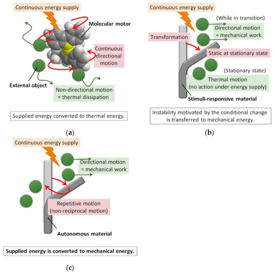 It is one of the dreams of chemists to create life or its imitative system using a synthetic chemical method [1,2]. Life is thought to be a collection of nanomachines, and their cooperative behavior is capable of performing work continually in a stationary environment. The process termed ‘dissipative self-organization’ is one of the key processes involved in this framework [3]. On the other hand, typical inanimate objects in which modules are not self-organized can only perform work passively under transient environmental conditions. Here, work is broadly defined to denote the transfer of energy to the surroundings in a form other than thermal motion; the mechanical work this involves is defined in Section 2. The function of continuously developing in a stationary environment is defined as an autonomous function; autonomy is the realization of continuity by the internal factors of the system.