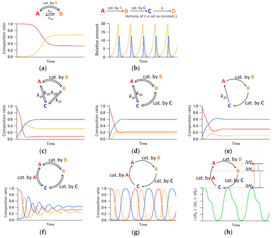 To simplify the discussion, we present here the simulation results while ignoring co-existing non-autocatalytic sub-routes within the autocatalytic steps [6]. In triangular-type reactions with one or two autocatalytic steps, it is easy to achieve equilibrium, as shown in Figure 2c,d. Even if we ignore the reverse processes, the reaction reaches equilibrium, as shown in Figure 2e. On the other hand, in reactions with three autocatalytic processes, periodic oscillations in the composition ratio are autonomously demonstrated, as shown in Figure 2f (taking into account reverse processes of autocatalytic paths) and Figure 2g (ignoring them). As described here, the kinetic equations indicate that multi-molecular oscillations may be generated by the contribution of plural nonlinear processes, and that the feature is emasculated by the coexistence of reverse processes. Note that autocatalysis is employed only because it is a well-known and easy-to-calculate nonlinear chemical process—other symmetry-broken phenomena, especially those with large nonlinearity and irreversibility, may contribute to realizing the oscillatory system.