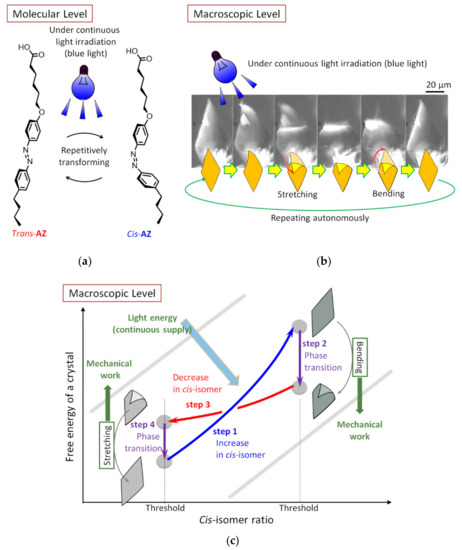 The submillimeter-size assembly of an achiral azobenzene derivative (AZ) showed an autonomous bending-unbending motion under continuous light irradiation (Figure 3). The photochromic compound repetitively changes its molecular structure between trans- and cis-isomers under light irradiation. Ordinarily, repetitive photoisomerization yields a mixture of isomers, the composition ratio of which is constant and depends on the photoreaction rates. However, in the study, a phase transition occurred before the ratio achieved the equilibrium value, switching the reaction rates. Coupling the sets of photoisomerization and its induced phase transition led to a periodic transition consisting of an increase in the cis-isomer, a morphological change, a decrease in the cis-isomer, and then to a morphological recovery [24,27]. The enthalpy also changed periodically with the cyclic process [25]; the cycle enabled autonomous energy conversion from light to mechanical work. At the bending motion, another asymmetry defines the direction of the transformation. According to the single-crystal analysis [25], the space group of the assembly was P1, and it was assumed that the asymmetry concerns the direction of bending. In addition, some break in symmetry is required to produce an autonomous swimming motion: if the bending-and-unbending motion is spatially reciprocal, it is impossible for the assembly to swim in a Newtonian fluid, as the Scallop theorem indicates [28]. The directional swimming of the assembly indicated that the morphological changes occurred in a non-reciprocal manner [26]. Furthermore, the authors also demonstrated signal-dependent pattern formation, a concept that can be applied to molecular-based information processors [25].