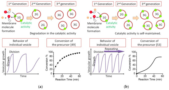 Considering the intrinsic feature of cell amplification, the concept of autocatalysis is fundamental [56,57], and all self-replications occur in an autocatalytic manner [7,58,59,60,61,62,63,64,65,66,67,68,69,70,71]. In the vesicular self-reproduction system without autocatalysis, the generated vesicles were different from the original ones—the catalytic ratio decreased proportionally in each generation, and the system tended to reach equilibrium, even if the precursor for the membrane molecule was continuously supplied (Figure 4a) [49,50,52]. This behavior is the same as inanimate systems. On the other hand, in the autocatalytic system, the catalytic ability is maintained across generations. When the precursor is supplied continuously or an excess amount of precursor is presented, or under both conditions, the individual vesicle repeats its growth and division periodically (Figure 4b) [53,54,55].