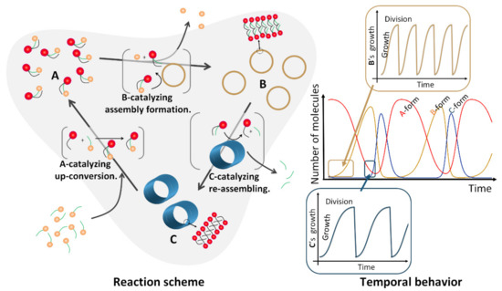 Cell amplification is also intrinsic to living things [1,2,44,45,46]. The pioneering study of the chemical model of cell amplification was reported by Luisi [47,48]. The team monitored the increase in oleate assembly in water following the addition of oleic anhydride and concluded that the autocatalytic hydrolysis of the anhydride occurred in the oleate assembly to form oleic acid [48]. Inspired by the study, Sugawara’s group designed a system where a membrane molecule formed from a bipolar amphiphile via hydrolysis, catalyzed by a molecule embedded in the vesicular membrane, and, thereby, captured the growth-and-division dynamics of vesicular assemblies [49,50]. In addition, they succeeded in demonstrating the amplification of DNA via a polymerase chain reaction within the vesicles [51,52]. Furthermore, the group firstly realized autocatalytic vesicular amplification systems, via organic synthesis [53,54]. Following these studies, Devaraj’s group [55] also reported the production of an autocatalytic membrane amplification system, in which a molecular catalyst formed spontaneously.