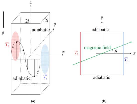 Concerning MHD (magnetohydrodynamics) natural convection, most of these studies are roughly divided into those in shallow horizontal enclosures and those in the vertical slots. Chandrasekhar’s textbook [] discusses the stability of a magnetic field applied to Rayleigh–Bénard convection. In recent years, Burr and Müller [,] have investigated the effects of both vertical and horizontal magnetic fields on Rayleigh–Bénard convection. Mistrangelo and Bühler [] discussed the effect of a horizontal magnetic field on a horizontal fluid layer in the presence of internal heat generation.