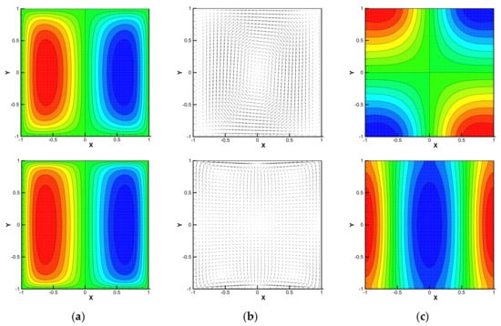 Basic states within a cross-section for the case of an infinitely long vertical enclosure. The upper ones indicate the case of X-directional magnetic field at Ha = 2, and the lower the case of Y-directional magnetic field at Ha = 10: (a) contour map of the vertical component of velocity, (b) electric current density vectors, and (c) contour map of the electric potential.