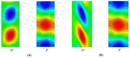 Velocity vectors, temperature and pressure at the onset of instability: (a) Pr = 0.01, kc = 1.347 and Grc = 487.97; (b) Pr = 0.7, kc = 1.405 and Grc = 502.59.