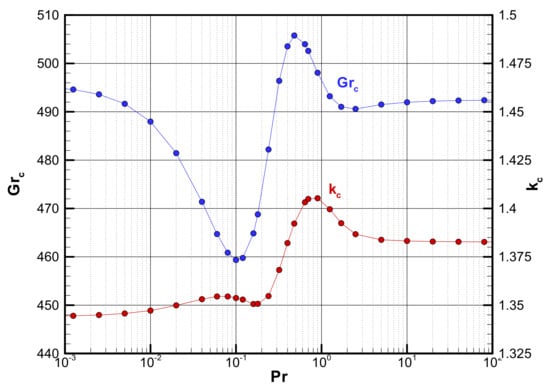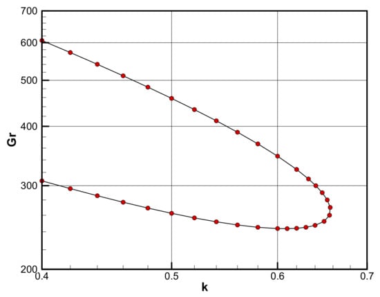 where, C3 is a positive constant for adjusting the convergence speed of Newton’s method. When the growth rate SR is positive, it means that Gr is decreased. This is effective in finding the lower branch in the neutral stability curve. As can be seen from Equation (25), when SR approaches zero, the value of Gr does not change and it converges. In this way, a neutral Grashof number can be obtained. On the other hand, in order to find the upper branch, the sign of the constant should be inverted. In the region connecting the upper branch and the lower branch, the gradient of the curve with respect to k is large, so it is more efficient to fix Gr and find k in the neutral stable state in order to keep computational accuracy. The more detailed numerical method on the linear stability analysis can be found in the recent paper [].