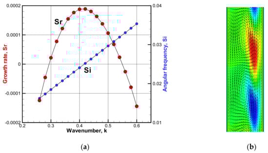 (a) Linear growth rate SR and angular frequency SI as a function of wavenumber k at Pr = 15 and Gr = 400 and (b) contour map of temperature and velocity vectors (visualized by compressing twice in the vertical direction) at Pr = 15, Gr = 400, k = 0.5, SI = 0.0297, and SR = 1.06 × 10−4.
