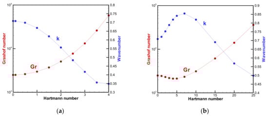 Effect of the Hartmann number on the critical Grashof number and the wavenumber at Pr = 0.025: (a) X-directional magnetic field and (b) Y-directional magnetic field.