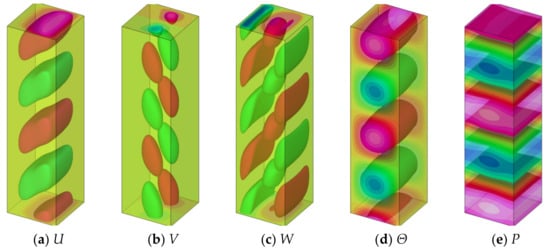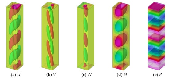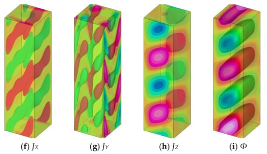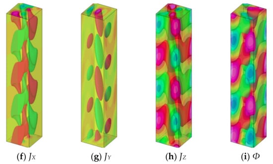 Figure 8 shows the visualization of the critical mode where a magnetic field is applied in the X-direction. The range of this three-dimensional visualization is for two wavelengths, but it is compressed in half in the vertical direction to save space. The vertical surface on the left side corresponds to the hot wall, and the vertical surface on the right side corresponds to the cold wall. (a) represents the velocity component in the X-direction, and the positive part is displayed in red and the negative part is displayed in green. This flow causes high and low temperature distributions, as seen in (d). In this case, since a weak magnetic field of Ha = 2 is applied, no large deformation is seen in the basic flow as shown in Figure 2. The velocity field, temperature field, and pressure field of (a), (b), (c), (d), and (e) are not much different from those in Figure 9. However, the current density and potential distributions of (f), (g), (h), and (i) are very different.