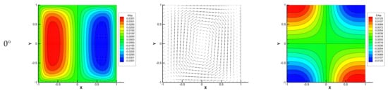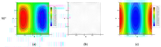 So far, the author has shown the effects of the X-directional magnetic field and the Y-directional magnetic field on the flow instability. It was found that the X-directional magnetic field is effective in stabilizing the flow when its strength increases, whereas the Y-directional magnetic field destabilizes the flow once, but it can stabilize the flow when the magnetic field strength increases. In both magnetic fields, the flow and electric potential fields in the basic state have two-fold line symmetry. Here, the author would like to discuss the stability of the flow when the symmetry of the basic state is slightly distorted. In other words, the author verifies the case where the uniform horizontal magnetic field is applied obliquely and investigates the symmetry breaking of the basic state and the corresponding critical Grashof number. When the angle between the magnetic field direction and the X-axis is defined as θ as seen in Figure 1b, θ = 0° corresponds to the X-directional magnetic field, and θ = 90° corresponds to the Y-directional magnetic field. As an example, the author demonstrated the numerical calculations performed in 15° increments for Ha = 3.
