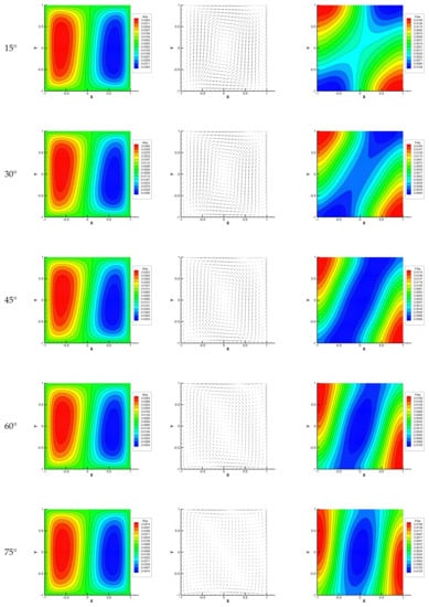 Table 2 shows the critical wavenumber and the Grashof number for each basic flow shown in Figure 10. The number of grids for the computations is the same as those for the basic flow, which is 50 × 50. It can be seen that the value of the critical wavenumber increases monotonically as the magnetic field angle increases. On the other hand, the value of the critical Grashof number decreases as the magnetic field angle increases. Note that even at 75°, the critical Grashof number is lower than in the case of no magnetic field.