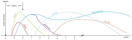 Hepatitis B viral antigens and antibodies detectable in the blood following infection.