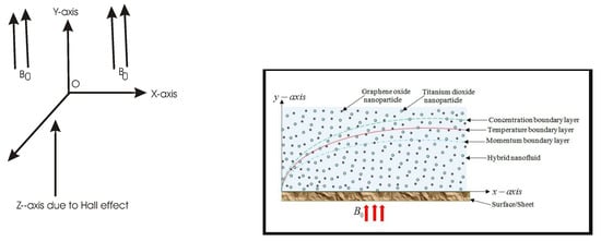 An incompressible viscous fluid flow is investigated with free stream velocity U, nanoparticles concentration C and temperature T. In water-based fluid, two types of nanoparticles, namely TiO (titania) and GO (graphene oxide), with volume fractions = 0.03 and = 0.04 are considered respectively. Magnetic field B = [0, B, 0] is applied perpendicularly to the heat and mass transfer flow. It is assumed that the strength of electric charge and magnetic field are maximum. The schematic diagram of the problem is shown in Figure 1.