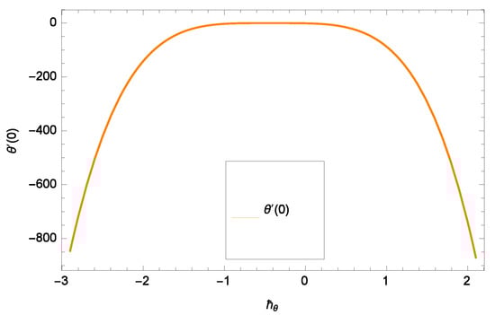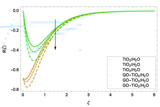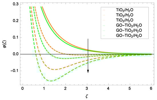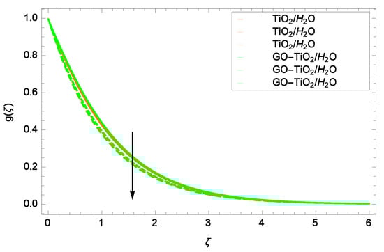 The Hall effect is exists on behalf of boosting the intensity of the magnetic field. Increasing the intensity of the magnetic field generates the Lorentz force resistance to the motion of mono and hybrid nanofluids (TiO/HO and GO-TiO/HO). For the clarification of the aforementioned statement, Figure 16 is drawn, where it is noticed that the flows of the fluids decrease. Flow with all its components (f, g()) reduces, which provides the deficiency of convection into the surface. Lorentz forces latent power boosts the nanoparticles volume fraction. During these conditions, the Lorentz forces work strongly on the flow, which ultimately reduces it. The irrelevance of the magnetic field for the flow for minimum value of magnetic field parameter M is likely that the enhancement of the convection through nanoparticles is at once removed via the applicability of the magnetic field. The last term in Equation (9) in non-dimensional form provides the proof that at low magnetic field strength and velocity g(), the Hall current parameter m controls fluids motion completely. Similarly, it is evident from the last term in Equation (10) that the velocity g() is decreased by improving the Hall current parameter m. Figure 17 authenticates that the flow component is extremely slow with the positive values of m. It may vanish completely to zero if m is enlarged.