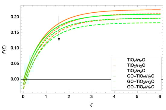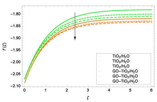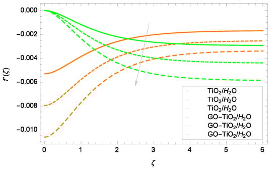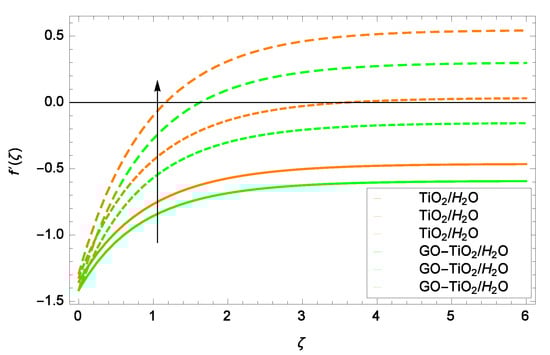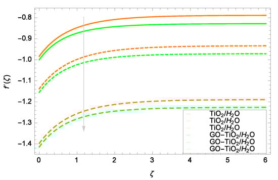 Figure 5 is presented to show the influence of Lorentz forces on velocity f. Observation from the graph reveals that velocity is decelerated for TiO/HO and GO-TiO/HO when the magnetic field parameter M increases on 1.00, 1.50 and 2.00. TiO/HO and GO-TiO/HO attain maximum velocity near the surface. Lorentz forces decrease the flow of TiO/HO and GO-TiO/HO. Figure 6 exhibits the effect of stretching/shrinking parameter on velocity f. Analysis is made for the stretching case, i.e., for > 0. When the surface stretches at the positive values of , the flow of mono nanoliquid and hybrid nanoliquid is accelerated. There is almost no distinct influential effect on velocity. Anyhow, the velocity of GO-TiO/HO is a little bit less in magnitude compared to that of TiO/HO. The reason is that the flow of TiO/HO is high due to the inclusion of one nanopaticle, while the flow of GO-TiO/HO is comparatively slow on account of two nanoparticles. Moreover, GO-TiO/HO has high viscosity compared to that of TiO/HO. The suction/injection or Stefan blowing parameter f effect on velocity f is portrayed in Figure 7. Due to suction (f> 0), near to the wall a vacant space is made. Fluid enters this vacant area to occupy it completely, consequently velocity f of TiO/HO and GO-TiO/HO is decreased. It is noted that in the central area of the channel, the velocity f is stable. Figure 8 reports that with the decreasing values of accretion/ablation parameter , the velocity of TiO/HO and GO-TiO/HO is also decreased. Interesting results are obtained for various values of . On adopting the positions 0 <<, it happens to achieve a leading edge ablation of the magnitude Ucot. On becoming the situation ≤< 0, in the backward boundary layer with trailing edge an accretion phenomenon is obtained. Implementing the case = 0 and = , the system becomes similar to familiar work, such as the Blasius flat plate study and Rayleigh–Stokes study in case of hybrid nanofluid.