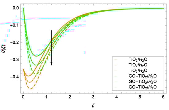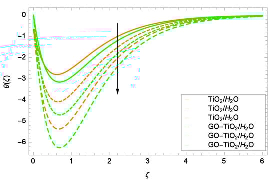 Figure 9 examines the influence of Prandtl number Pr on the nanoparticles temperature distribution (). With higher values of Pr, () is diminished. Viscous forces exert a uniform effect on heat transfer for the whole of location of the channel. Figure 10 is designed to show the effect of stretching/shrinking parameter on temperature (). Both of the TiO/HO and GO-TiO/HO have shown decrement in temperature for the increasing values of . The temperature of the GO-TiO/HO is comparatively a little bit higher than that of TiO/HO in stretching phenomena. Figure 11 exposes that as the Stefan blowing parameter f increases, the temperature of TiO/HO and GO-TiO/HO is decreased. Close to the wall, the decrement in heat transfer is most prominent. Sucking extracts the heat from both of the fluids.