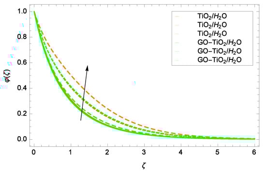 Figure 12 reveals that the addition in Schmidt number Sc increases the concentration. Through high values of Sc, viscosity is enhanced. Since the viscosity is the characteristic on account of cohesive forces within different layers of TiO/HO and GO-TiO/HO which have relative movement, the nanoparticles concentration is enhanced. By dispersing the nanoparticles into the water, the viscosity enhances, resulting in an increase in the cohesive forces. Figure 13 displays the suction/injection parameter f, which has a dominant role in diminishing the nanoparticles concentration . Due to suction (f > 0), the nanoparticles close to the wall remained in lower numbers, so the nanoparticles concentration is dilute. Therefore, the nanoparticles concentration decreases with increasing the suction parameter f.