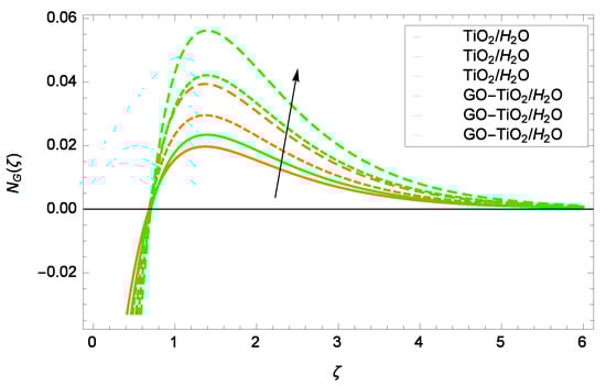 Entropy generation rate N() and Reynolds number Re are projected in Figure 14. Keeping the consideration of the definition of Re, it is observed that there is an increase in entropy generation for the entire range of . This is due to the addition of nanoparticles and the drag associated with them. Figure 15 is designed to show the effect on entropy generation rate by Brinkman number Br. The enhancements in Br contribute to the dynamic viscosity of TiO/HO and GO-TiO/HO. Strong cohesive forces are generated, which enhance the entropy generation rate N().