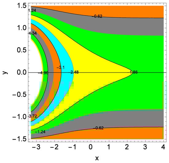 The continuity Equation (1) is identically satisfied through Equation (8). Information is deducted from Table 1 and Table 2 and Equation (8) to get the following equations from Equations (2)–(7)